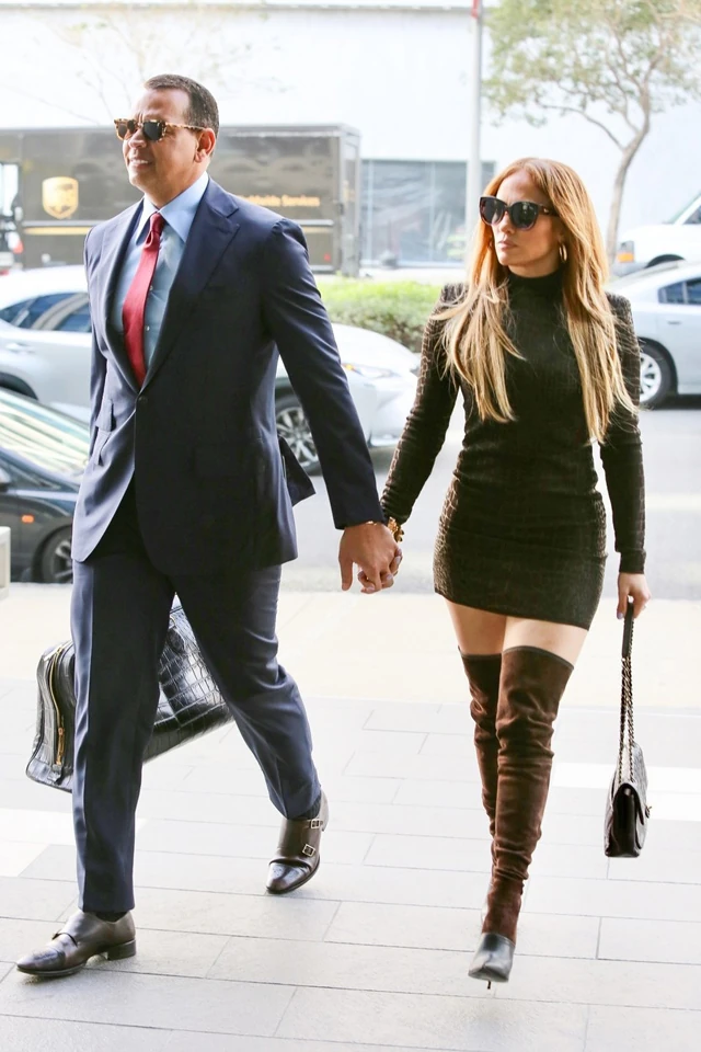 A szupersztár a sötétszínű, krokodilbőrmintás ruhát sötétbarna velúrcsizmával párosította és a Chanel klasszikus steppelt, láncos táskájával. Ezúttal hosszú tincseket kapott és az elengedhetetlen napszemüveg és karikafülbevaló sem hiányzott a szettjéből. Vőlegénye, Alex Rodriguez pedig hozta a tőle megszokott öltönyös eleganciát.