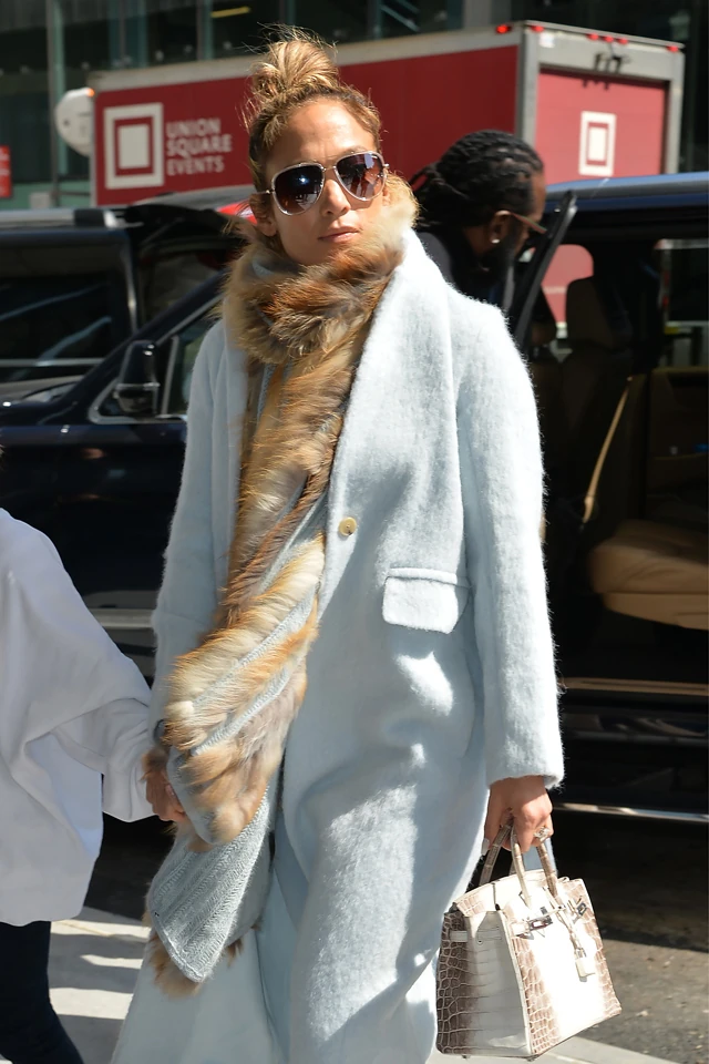 Igaz, hogy JLo laza, sportos szettjére felöltött egy dögös világoskék kabátot és a szőrme sem hiányzik a nyakáról, ahogy az Hermés táska sem, de a feje tetejére könnyedén felcsavart haja és a sportcipő arra utal, hogyha eddig nem is, de ezután edzésre kerül a sor.