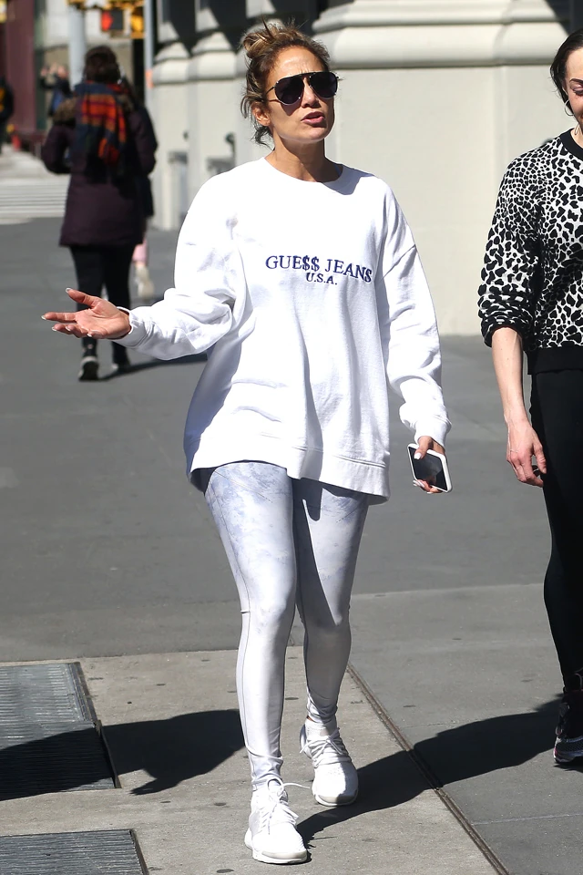 Nem sokkal azelőtt pedig testvérével, Lynda Lopezzel fotózták le New York utcáin. Jennifer ekkor is sportszettben sétált húgával, a fehér edzőcipőjéhez metálos fényű jóganadrágot és egy oversize, fehér Guess pulcsit vett fel. Dögös még így is, mint mindig.