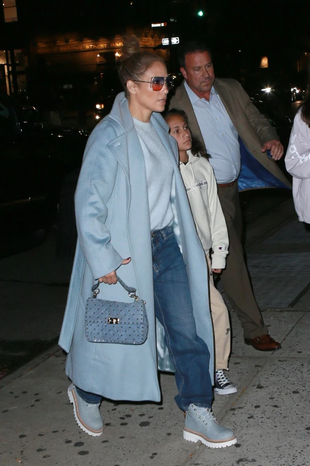 Jennifer Lopez a családi esti kiruccanáshoz egy nagyon menő tone-one-tone szettet lőtt el. Laza, boyfriend fazonú kék farmerjéhez egy világoskék pulcsit viselt, amire egy hosszú, szintén világoskék szövetkabátot dobott fel, kiegészítőnek pedig világoskék bakancs és szegecses kistáska – csak, hogy ne hiányozzon megjelenéséből a glamúr.