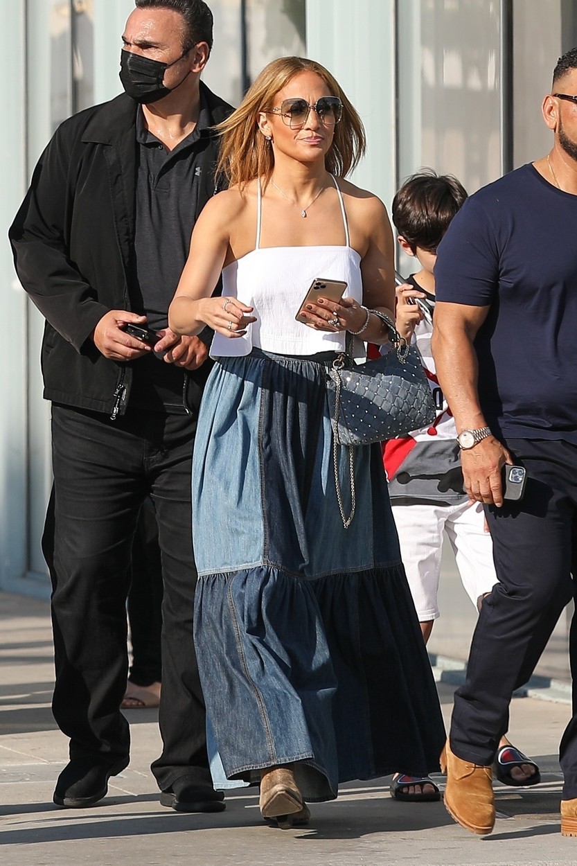 JLo ezt a szettet fiával és menedzserével közös shoppingtúrája alkalmából viselte Los Angeles-ben, ahol jelenleg minden szem rá szegeződik, hiszen újra összemelegedtek a 2000-es évek elejei vőlegényével és volt szerelmével, Ben Affleck-kel.