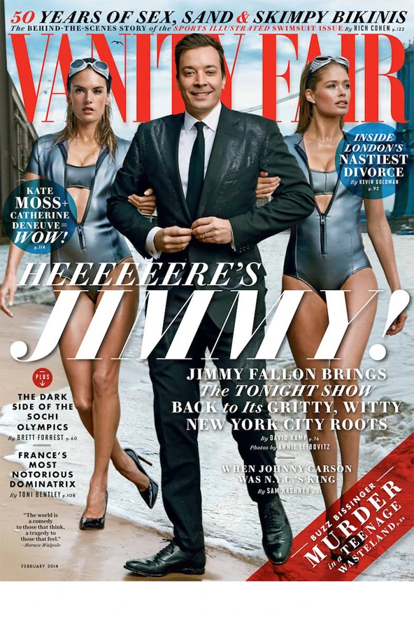 A rendkívül sikeres és közkedvelt műsorvezető eddig saját, Late Night with Jimmy Fallon show-ját vezette, miután hat évig volt a híres Saturday Night Live zenés, szórakoztató tévés program házigazdája. A Vanity Fair annak kapcsán kereste fel a sztárt, hogy Jay Leno helyett ő fogja ezentúl a The Tonight Show-t irányítani. A magazin által készített interjúban mesélt gyerekkoráról, beteljesült álmairól és az előtte álló új kihívásról. Stílusosan, két szupermodell gyűrűjében fotózta Jimmy Fallont a legendás Annie Leibovitz a címlaphoz, amint a sikkes búvár szettes Alessandra Ambrosio és Doutzen Kroes modellek társaságában partra száll, akárcsak James Bond. Neked bejön ez a címlap?