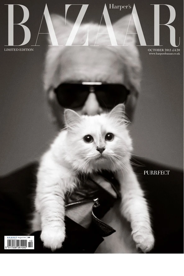 Karl Lagerfeldd Choupette cicájával a Harper´s Bazaar címlapján