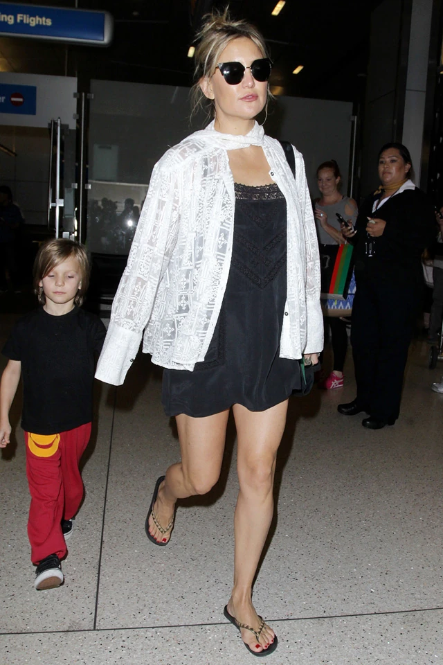 Most ugyan nem fürdőruhás szelfiről van szó és nem is valami szexi, vörös szőnyeges összeállításról, Kate Hudson csupán kisfiával, Bingham Bellamyval érkezett a Los Angeles-i reptérre. Míg egyes kolléganői komoly sportot űznek abból, hogy mennyire csinosra, sőt egy kész divatshow -ra veszik a reptéri megjelenést, addig Kate Hudson lazán, egy kis, nyári ruhában, papucsban és lazán felkötött hajjal landol.