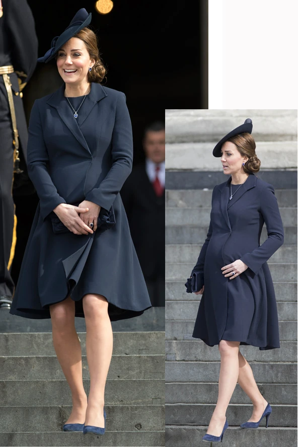 A hercegné most már minden nap valamilyen hivatalos eseményen vesz részt, annak ellenére, hogy kijelentették, otthon fog pihenni és készül a pici érkezésére. Ehhez képest az elmúlt napokban filmstúdiókat látogatott, galériákban járt, most pedig részt vett a londoni Szent Pál katedrális ceremóniáján, melyen az afgán támadási hadműveletek lezárásának évfordulójára emlékeztek. Az alkalomhoz illően Katalin sötétkékben érkezett, kalappal a fején Vilmos és a királyi család többi tagjának társaságában. De nézd csak, milyen édesen kidomborodik ruhája alól a nagy pocakja. Hát nem gyönyörű?