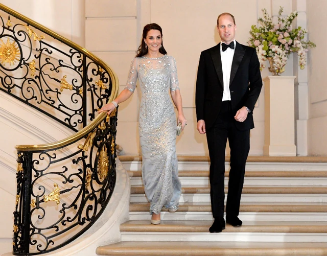 Az esti vacsorára már egy fokkal látványos, jégkék, gyönyökkel és ezüstflitterekkel díszített florális mintás ruhát választott egyik legkedvesebb dizájnerétől, Jenny Packhamtől. Mindkét alkalommal lélegetelállítóan gyönyörű volt Kate Middleton.