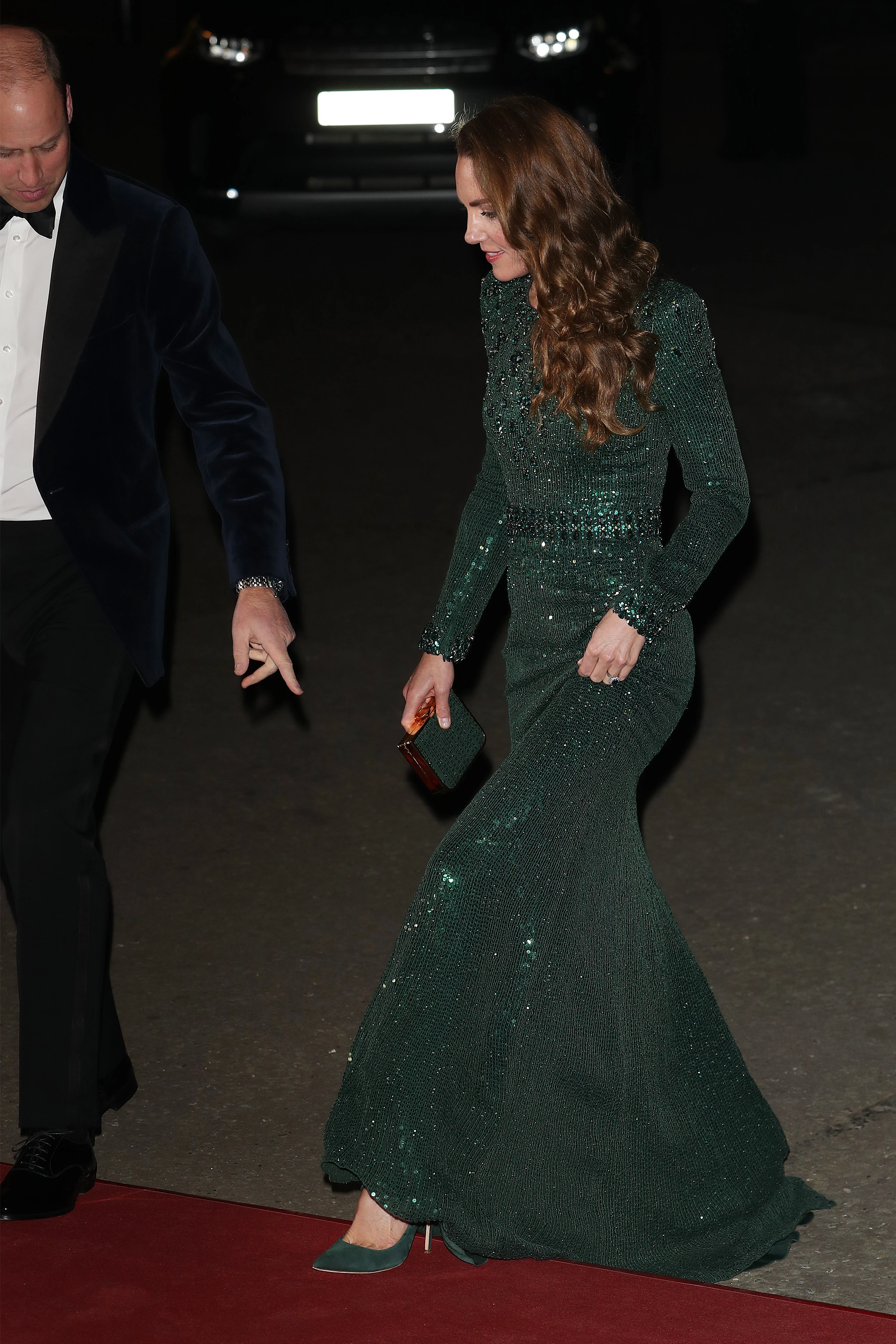 A hercegné a filmpremieren akkor gyönyörű arany, csillogó ruhában jelent meg, a csillogást pedig most sem hanyagolta, ezúttal a Royal Albert Hall éves varieté műsorán vettek részt, most sötétzöld, földig érő ruhában mutatkozott, a haját pedig féloldalra fésülték nagy hullámokban.