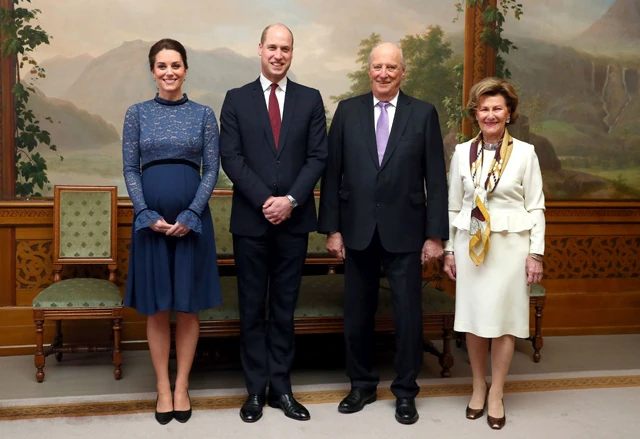A Catherine Walker & Co. kabát alatt egy újabb kék ruha rejtőzött, a csipkefelsőrészes darabban a várandós Katalin hercegné nagyon csinos volt, és a norvég királyi párral aranyosan pózoltak a hivatalos közös fotójukhoz.