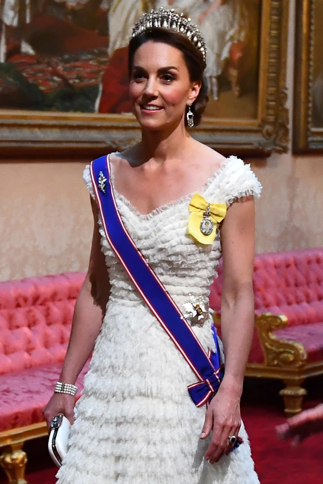 Úgy tűnik, hogy eddig minden simán és botrányoktól mentesen alakul. A Buckingham Palotában megrendezett vacsorán Kate Middleton is részt vett és ismét igazi hercegnéként tündökölt. A fehér, fodros Alexander McQueen ruha kitűnő választás volt részéről erre az estére, ami tökéletesen kiemelte azokat a kitüntéseket, amiket Erzsébet adott neki az elmúlt években.