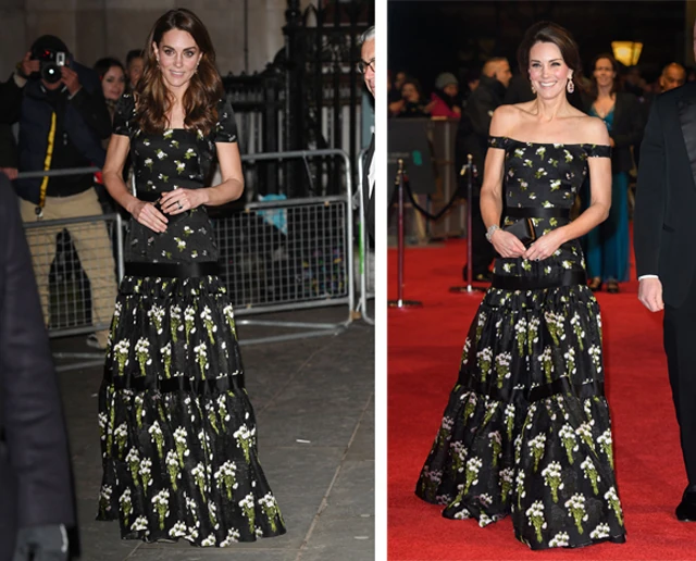 A különleges, ráncolt szoknyás, fekete alapon virágmintás Alexander McQueen kreáció nem véletlenül lehet ismerős, a hercegné már 2017-ben sem először viselte a BAFTA gálán, csak ezúttal egy kicsit még módosítottak is a vállán. Legutóbb ugyanis a ruha lehúzható vállú volt, most pedig rövid ujjakat varrtak hozzá, így kevésbé volt estélyiruhás a hatása.