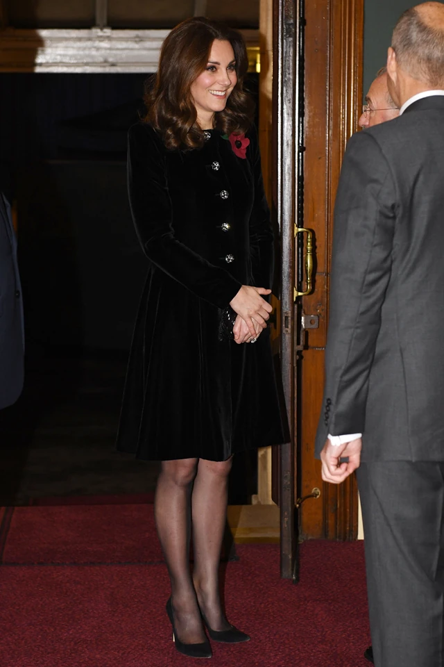A hercegné tapintatosan feketét viselt, azonban nem akármilyet, Katalin egy csinos fekete bársony ruhában érkezett a megemlékezésre, amit fényes csillogó gombok díszítettek. Az A-vonalú ruha szabásának köszönhetően a 35 éves hercegné terhes hasa szépen elrejtőzött a szoknyarész alatt, de Kate gondosan arra is figyelt, hogy kistáskájával takarásban legyen a pocakja.
