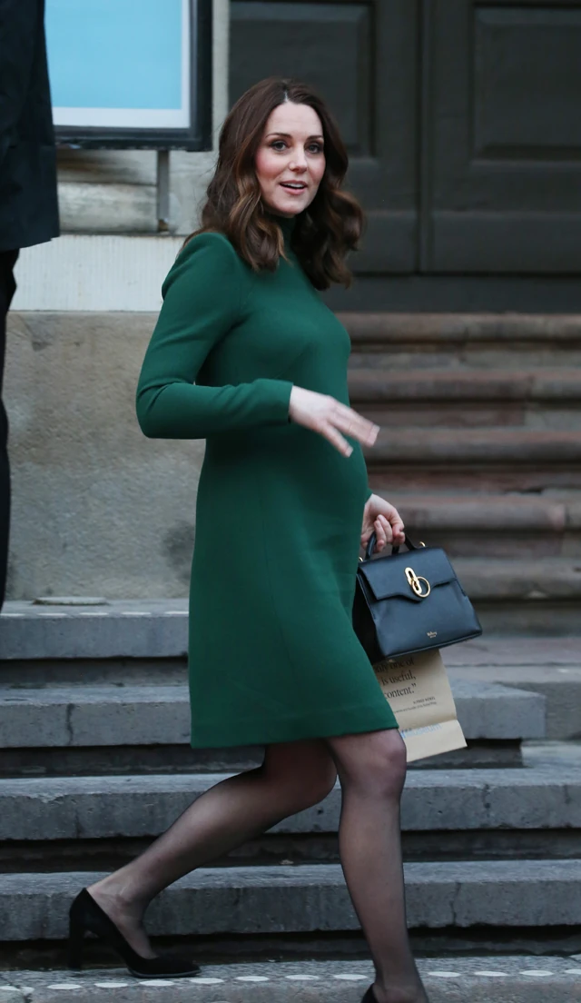 Később már egy, a kabátjához színben illő pamutruhában láthattuk, és még a téli csizmáját is egy fekete magas sarkúra cserélte, a csinos Mulberry táska azonban maradt.