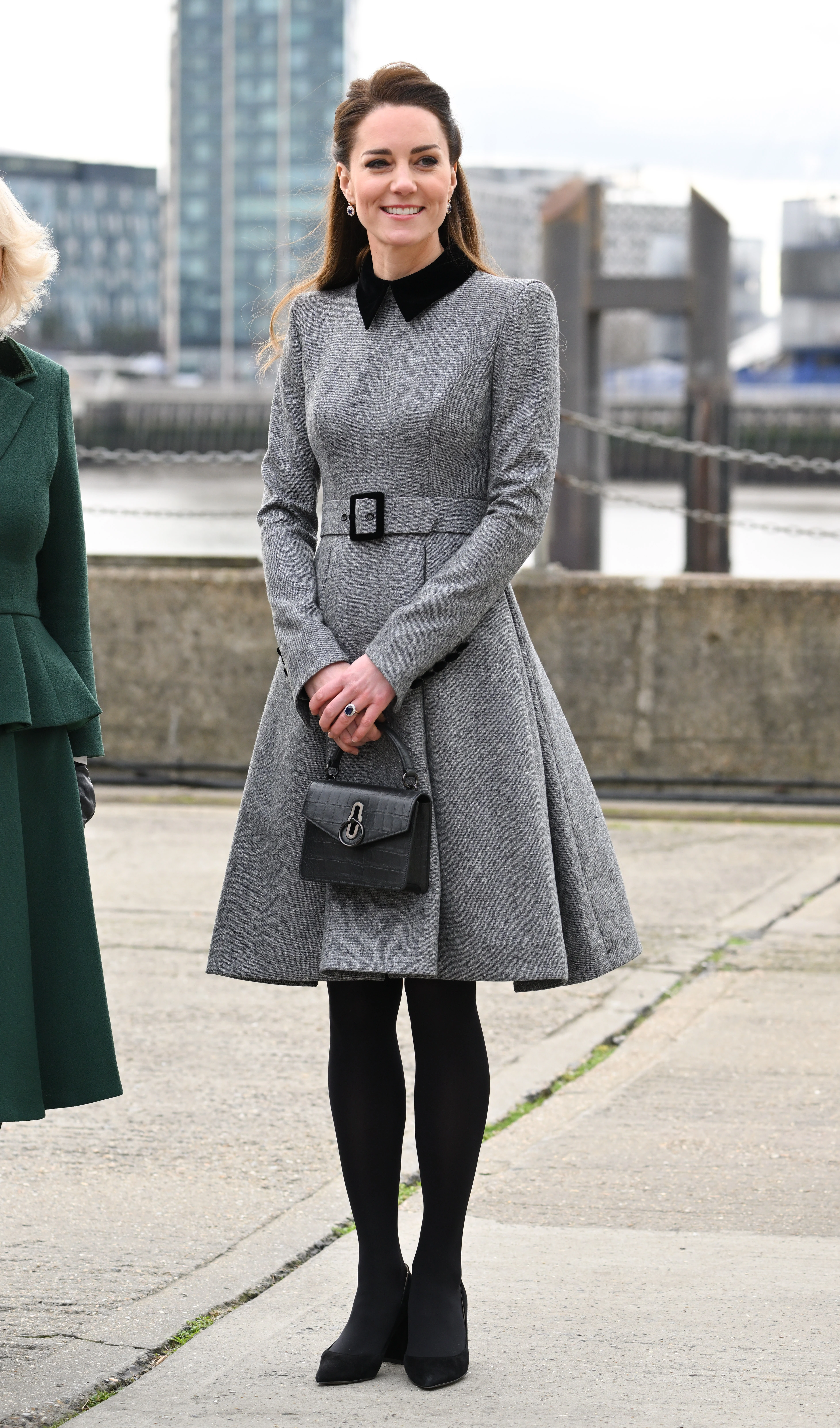 Kate Middleton a különleges alkalomra a gardróbjának egyik legemlékezetesebb darabját viselte újra, ezt a szürke tweed Catherine Walker ruhát ugyanis neki tervezték direkt, és a hercegné már számos alkalommal felvette különböző alkalmakkor.