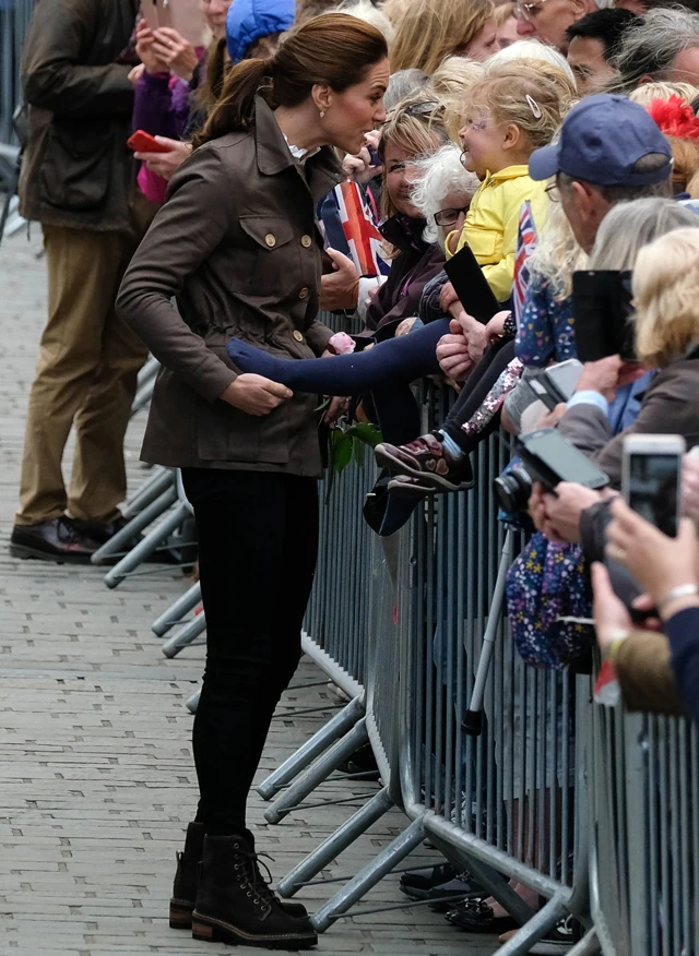Kate Middleton megint vagány, farmeres, bakancsos szerelésben mutatkozott, a Chloé bakancsát egyébként már többször láthattuk rajta, a Taylor London gombos dzsekijében pedig tényleg olyan volt, mint egy igazi belevaló modern vidéki farmerlány. Természetesen az üdvözlésre összegyűlt alattvalók imádták a hercegi párt. A hercegné természetessége ezúttal is megmutatkozott, közvetlenül beszélgetett, fotózkodott az összegyűltekkel és még arra is figyelt a kutyákkal is törődjön egy keveset.