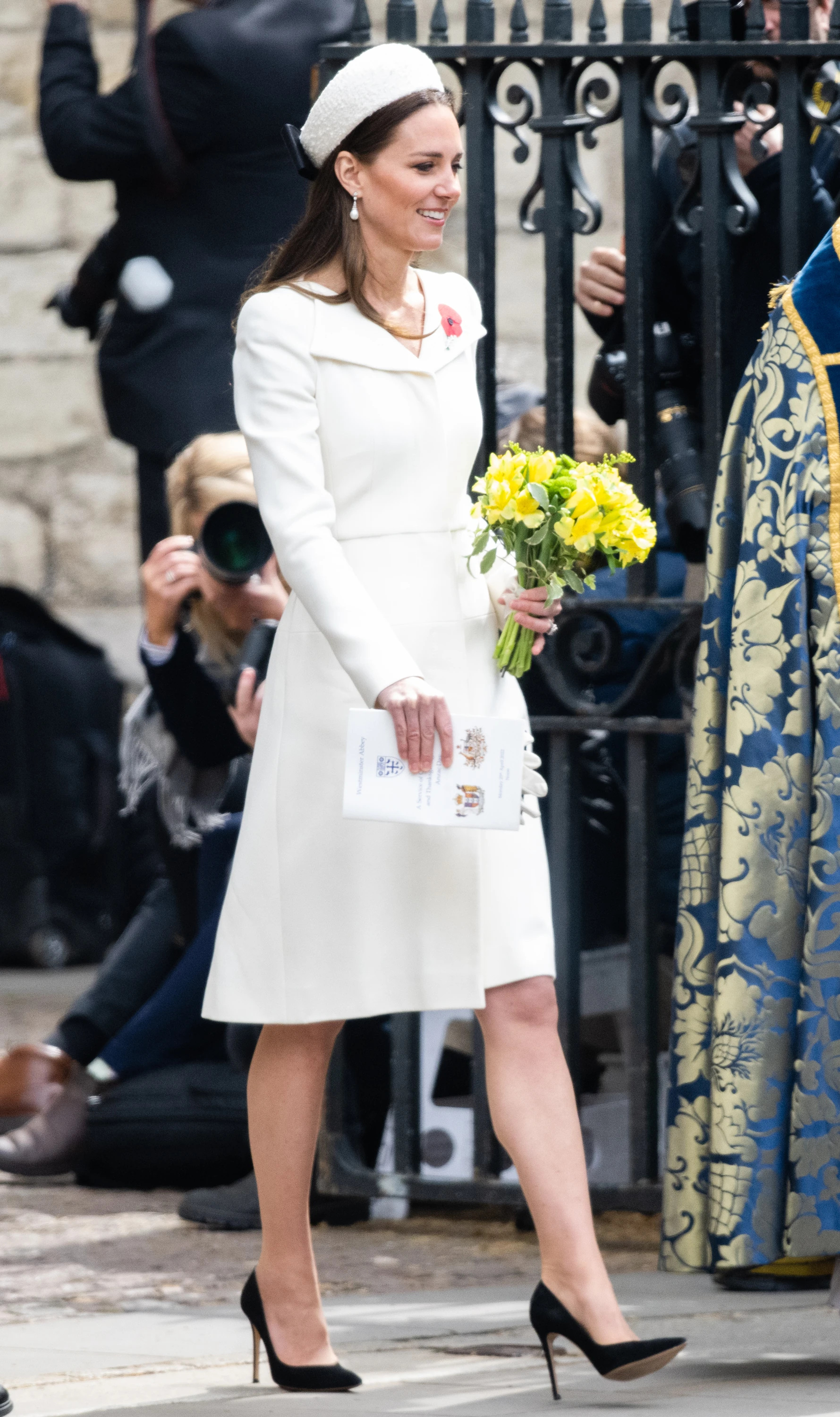 Ez a fehér kabátruha a hozzá passzoló kalappal egy Alexander McQueen kreáció, a divatmárka Katalin kedvencei között van, amióta egy, Sarah Burton által tervezett lélegzetelállító, Grace Kellyére hajazó ruhában kimondta boldogító igent Vilmos hercegnek immár több mint 10 éve. Azóta rendszeresen viseli a kreációit hivatalos eseményeken, körutakon és családi fontos pillanatok alkalmával is, mint például Sarolta hercegnő keresztelője, ahol először volt rajta ez a stílusos darab.