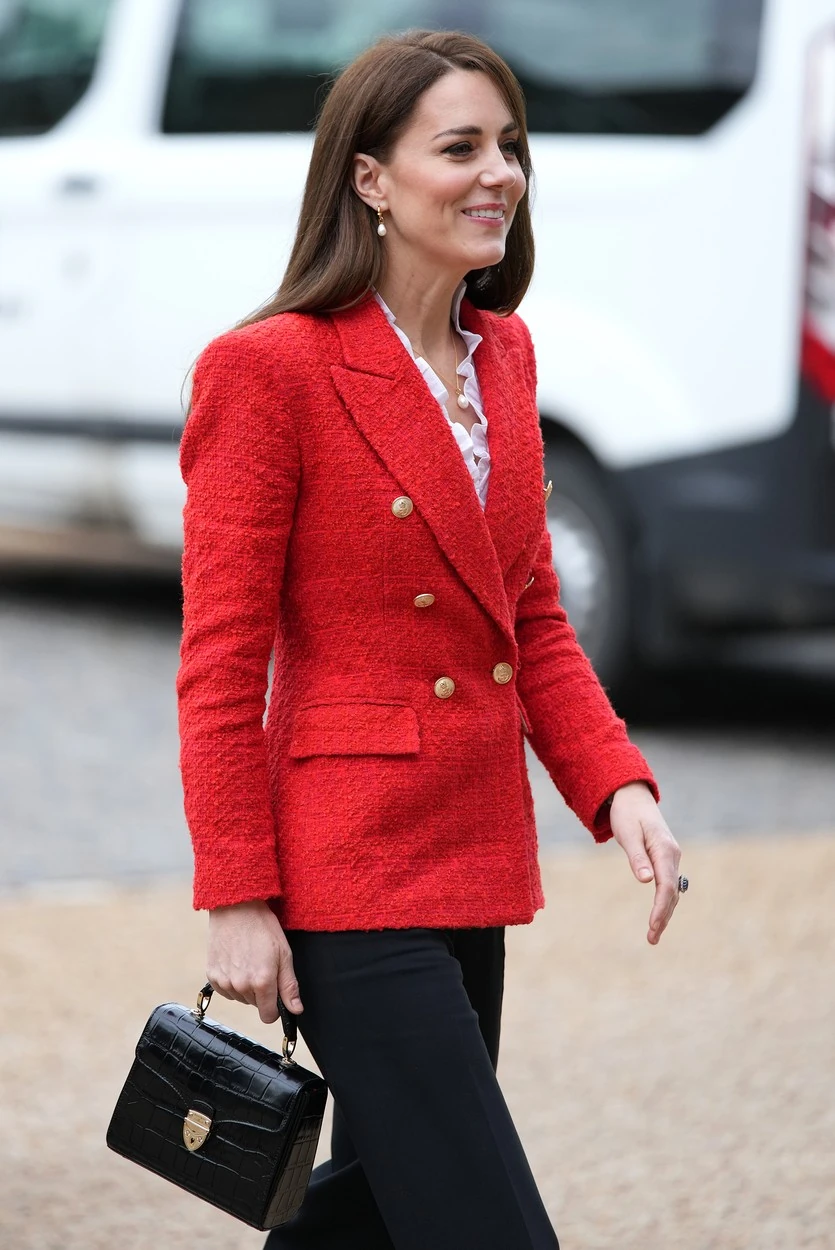 Kate Middleton a látványos darabot fehér fodros blúzzal, fekete nadrággal, magas sarkúval és Aspinal of London kistáskával párosította az elegáns, üzleti megjelenés jegyében.