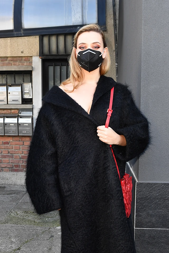 Az eseményre egy hosszú fekete kabátban és vörös kiegészítőkkel érkezett, a maszkja is tökéletesen ment a szetthez.