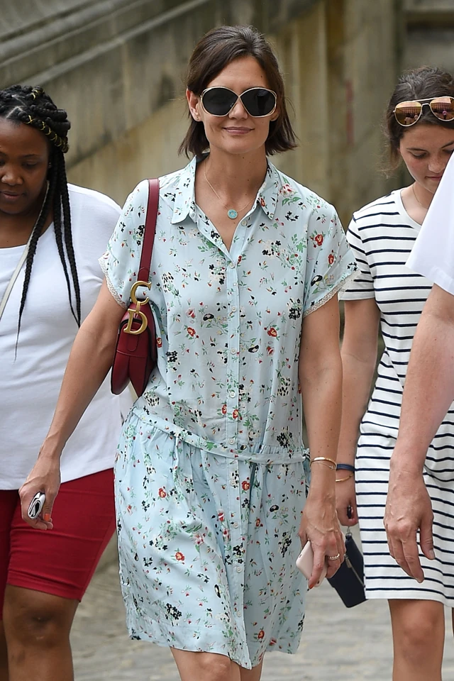 Katie Holmes egy aranyos virágmintás ingruhában, fekete balerinában és bordó táskában vágott neki a francia fővárosnak: