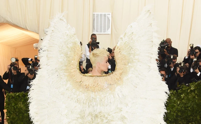Katy Perry egy gyönyörű arany Versace ruhát viselt, szexi combig érő csizmával, viszont az egész összeállítás extravaganciáját az énekesnőnél is magasabb, óriási angyalszárnyak adták meg.