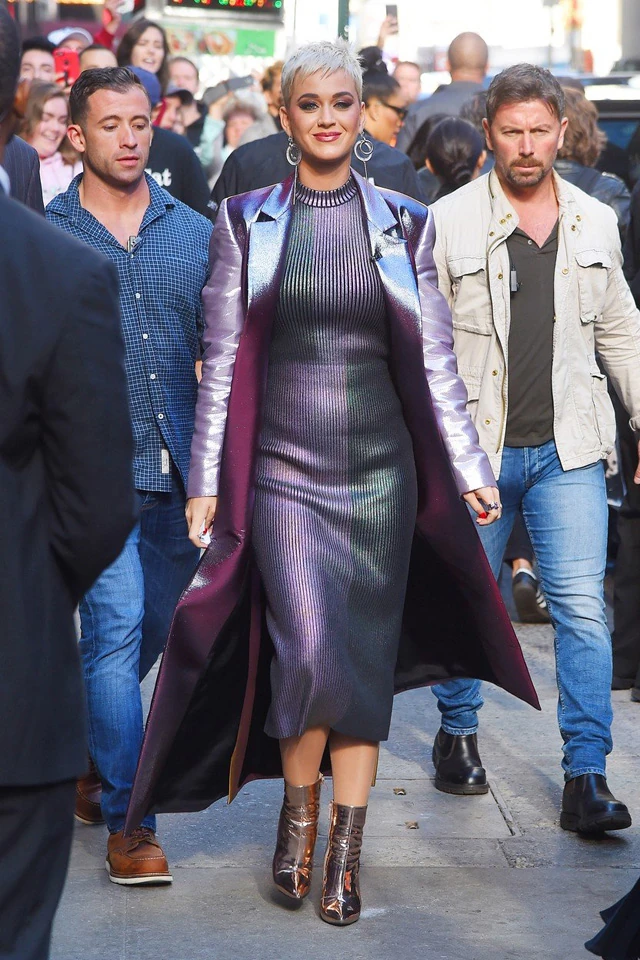 Katy Perry izgalmas napot zárt tegnap este: a 32 éves híresség az újrainduló Americal Idolban hallgatta meg a legújabb jelentkezőket, ugyanis a műsorban ezúttal ő is zsűriként szerepel. Az énekesnő - szerepéhez mérten - egy nagyon szigorú ruhadarabot választott az eseményre. A fekete-lila, metálos csillogású outfit remekül kiemelte az alakját és a tónusait, és mindezt csak fokozta a vádliig érő, fényeslila kabátja.