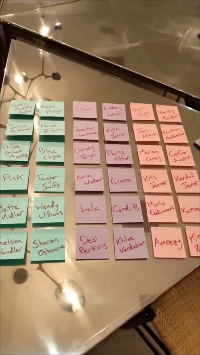 Ismerősei nevét is három csoportba osztotta. Annyi biztos, hogy a kékeszöld post-it az ellenségeket mutatja, hiszen azokon láthatjuk Taylor Swift, Chloë Grace Moretz és Blac Chyna nevét is.
