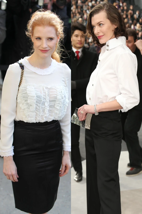 A valószínűtlenül vékony Milla Jovovich például a nadrág-ing variációra szavazott, amely csodásan illett fiús alkatához és modern arcvonásaihoz. Jessica Chastain pedig a klasszikus nőiesség nagykövete ebben a szettben: csipkés blúzhoz enyhén magas derekú szoknyát párosított, hogy kihangsúlyozza nőies idomait.