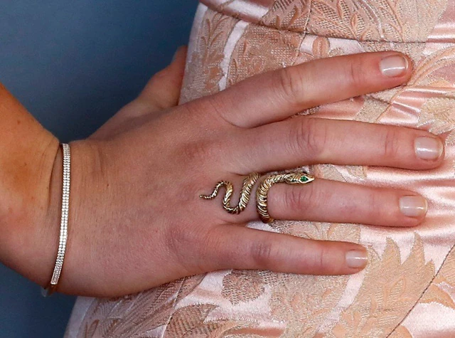 A megjelenése egészen bájos, hiszen egy pánt nélküli Dolce & Gabbana ruhára esett a választása, ami talán annyira nem illik a stílusához, de tényleg csinos volt benne. Igaz, közelebbről megnézve egyáltalán nem volt olyan összeszedett a megjelenése. Egyrészt a pánt nélküli ruha alá nem igen szokás pántos melltartót venni, de még ez is hagyján, de valahogy csak a cicifix felét sikerült beerőszakolnia a ruhája alá, így aztán oldalról egy kissé furcsán festett. Úgy látszik, hogy Jennifer Lawrence is kedveli a Gucci új kígyós ékszereit, villantott is egy ilyen gyűrűt az eseményen. Nos, amikor meg ezt akartuk szemügyre venni, akkor láttuk, hogy vagy rosszul mosta le a körömlakkját a színésznő, vagy egyszerűen koszos a körme. Nem is ő lenne, és ráadásul az összehatással még így se lehet gondunk.