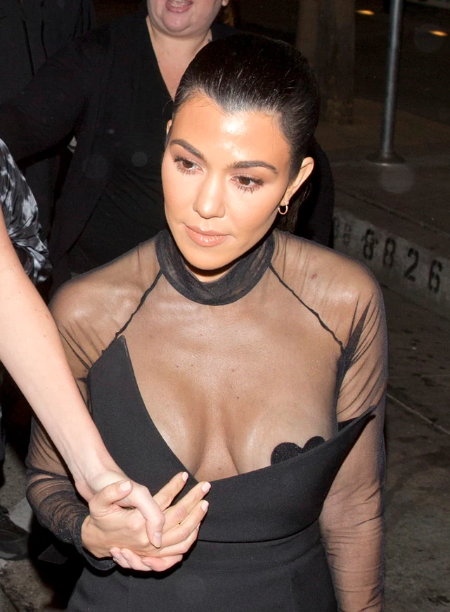 Pánt nélküli szűk ruhája alatt csak egy átlátszó body-t viselt, így nem sok minden takarta melleit. Szerencsére Kourtney nagyon kreatív volt és villantás helyett inkább a bimbótapaszt választotta. Nem is akármilyet! Szívecske alakút!