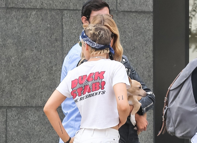 Nemrég a Chanel partiján egy szintén nagyon rövid, fiús frizurát mutatott, ami elég furán nézett ki. Most azonban Kristen Stewart barátnőjével, Stella Maxwellel sétálgatva hiába rejtette félig egy kendő alá a haját, mégiscsak látni lehetett, hogy valami értelmezhetetlen foltos, foltokban színes frizurát láthattunk. Kicsit olyan mintha a színésznő ült volna a fodrásztanfolyamon osztályutolsó tanonc székébe. Nem egészen értjük a koncepciót, de ez a kendő kifejezetten jó ötletnek tűnik.