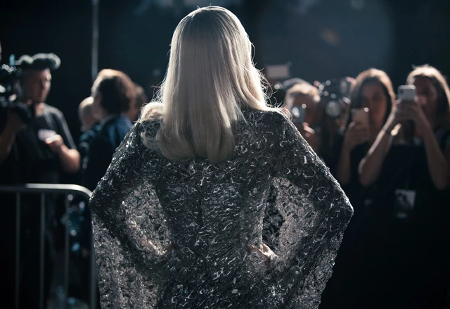 A nagy uszályos ruhája is a ´40-es, ´50-es évek nagyszabású Oscar-bevonulásait idézte. Ugyanakkor a fémes hatású Givenchy ruha egyúttal olyan is volt, mintha Lady Gaga a Trónok harcából ugrott volna elő. Simán elhinnénk, hogy a Vastrónért száll harcba ebben a szerelésben.