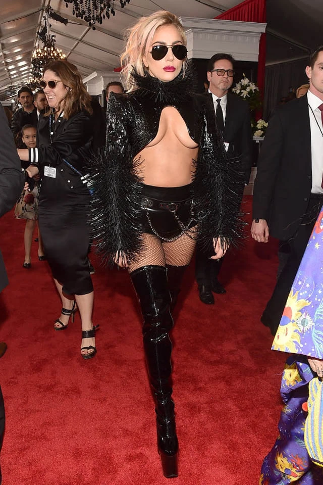 A 30 éves popsztár, aki a Grammy gálák legördögibb szettjeinek viselőjeként vonult be a történelembe, idén sem adott alább. Lady Gaga idén nagyon rockosra vette a formát – érthető módon -, és egy sokat mutató, láncos, rojtos, fekete latex Alex Ulichny kreációban érkezett a vörös szőnyegre.