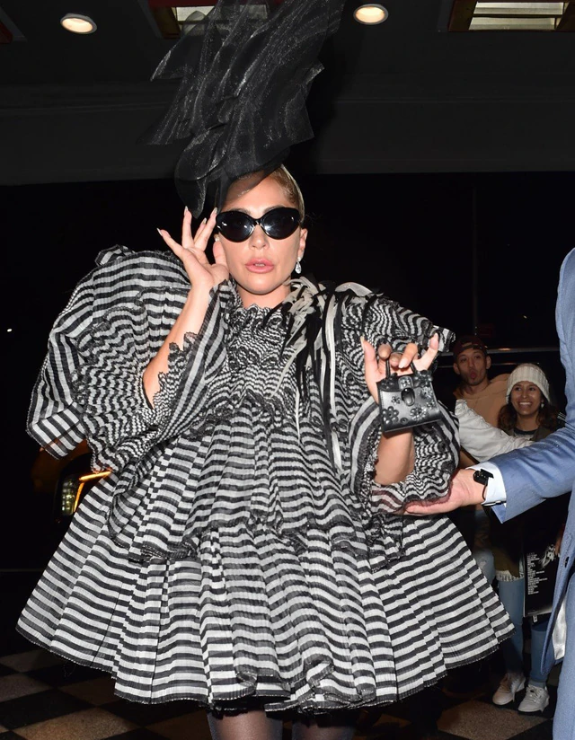 A New Yorkban tartott előpartira aztán a régi időket felelevenítő terebélyes miniben érkezett. A nem éppen szokványos ruhát Marc Jacobs tervezte, aki mintha csak Lady Gagára gondolt volna, amikor kitalálta ezt a ruhát. A maga őrült módján szuperül áll a szett az énekesnőnek.