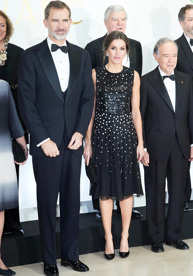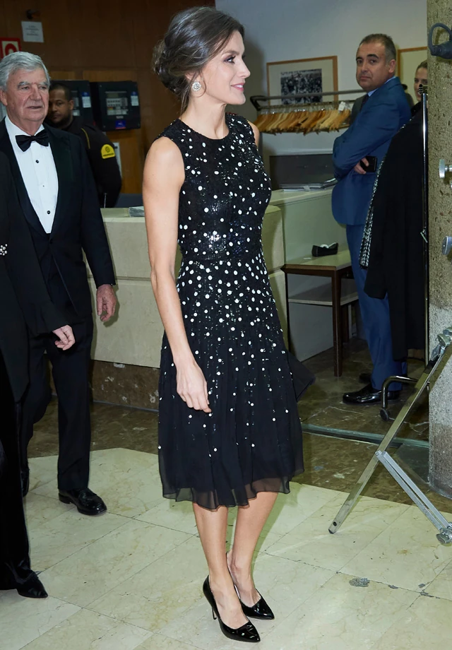 Letícia az újságíróknak szervezett díjátadón egy fekete Carolina Herrera ruhát viselt, aminek felső része csillogó anyagból készült, és a fehér pöttyökkel egyszerre idézi a csillagos eget, vagy a hópelyheket. Káprázatosan szép.