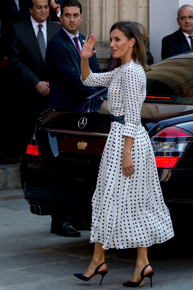 Azt mondják szeptemberben már nem ildomos fehéret viselni, hiszen ez már az ősz, és a fehér a nyár színe, de Letícia királyné bebizonyítja, hogy ezeknek az elévült szabályoknak már semmi értelme. A királyné Fülöp királlyal egyik legutóbbi közös hivatalos látogatása során egy szuper későnyári apró, fehér alapon fekete mintás ruhát viselt. A ruha hosszú ujja és a derékon viselt fekete öv eleganciát vitt a nyárias öltözékbe, és a fekete, nyitott magas sarkúval kiegészítve Letícia királyné egy újabb tökéletes összeállítást mutatott.