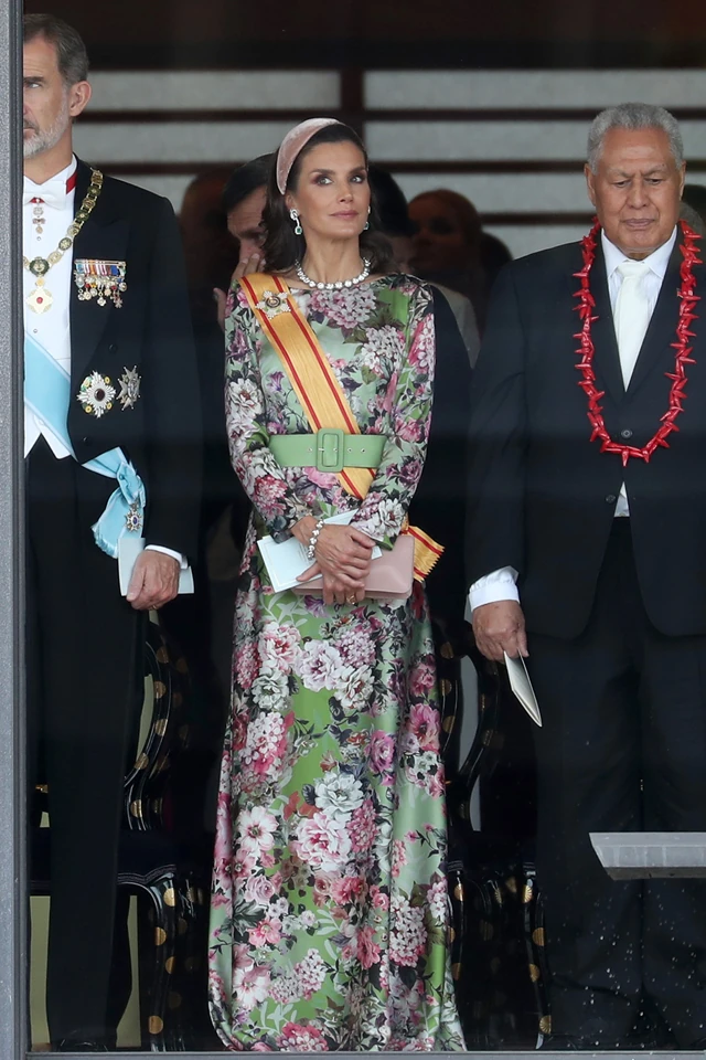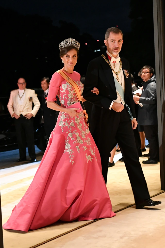 Letícia királyné egyszerűen lehengerlő volt magán a koronázási ceremónián, de az azt megelőző banketten is. A spanyol királyné a trónra emelésre egy gyönyörű, hosszú nagy virágmintás selyemruhában érkezett, ami a japán kultúra előtt tisztelgett, a gyémántékszerekkel és a rózsaszínű kiegészítőkkel egyszerűen pazar volt a megjelenése.