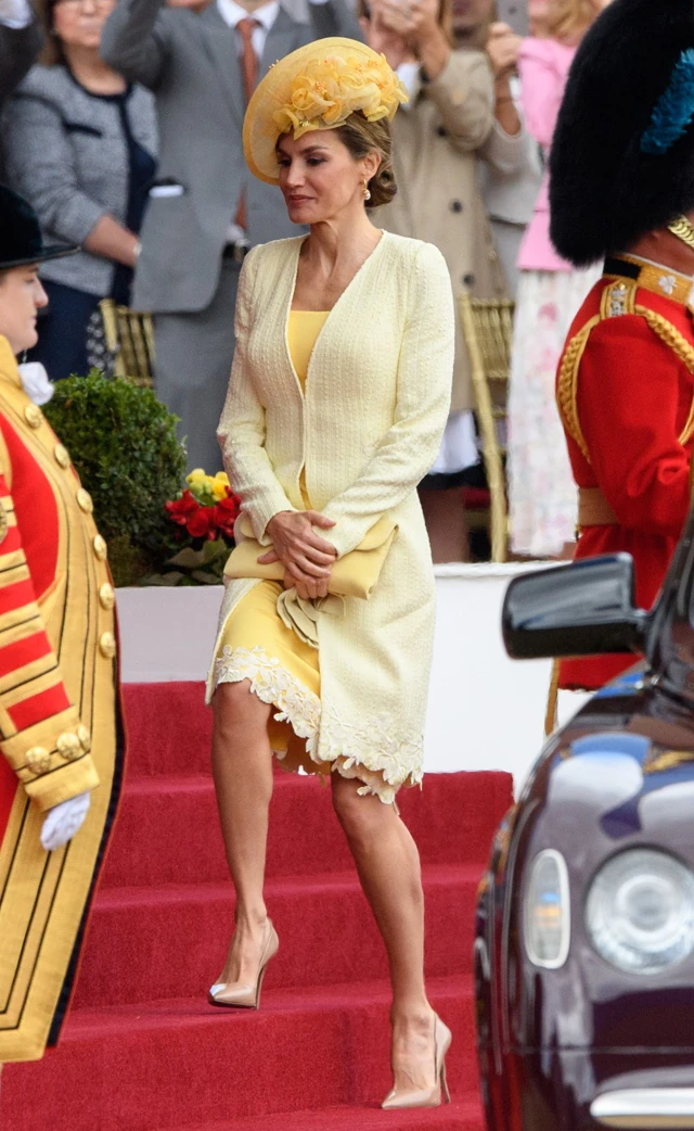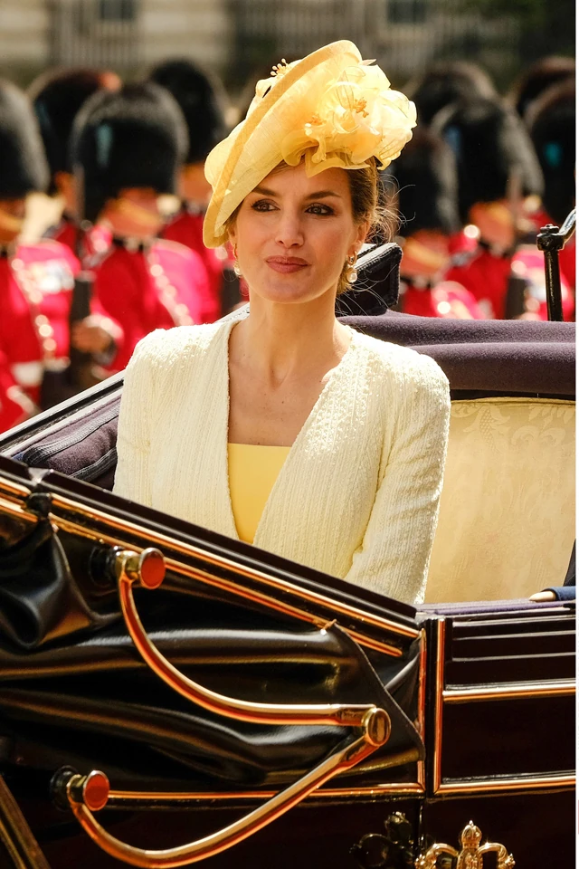 A sárga stílusos összeállításban Letícia méltó ellenfele Katalinnak, és az angol királyi udvar protokolláris elvárásainak megfelelően szépséges kalapja csak még nagyobb dob a csinos megjelenésén.