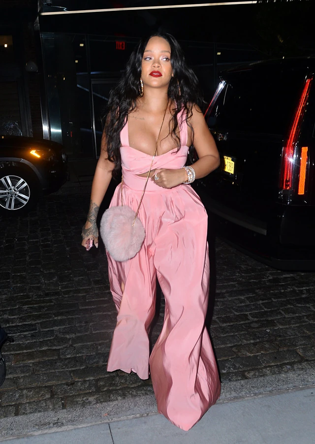 Így történt ez múlt szombaton is, amikor egy rózsaszín Rosie Assoulin overallt öltött magára, ami enyhén szólva is előnytelen a világ összes létező testalkatára. A ruha már-már kínos módon kidobta az énekesnő dekoltázsát, míg deréktól lefelé olyan basanadrággá szélesedett, ami leginkább a hastánc videókból lehet ismerős. És ha mindez nem lenne elég, még egy azonos színű, szőrös táskát is villantott hozzá Riri, hogy végleg kivágja a biztosítékot minden divatérzékeny rajongónál. Nos, ez garantáltan sikerült.