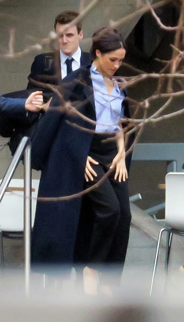 Meghan laza fekete nadrágot viselt, világoskék blúzt és sötétkék szövetkabátot! Hát nem vagány?