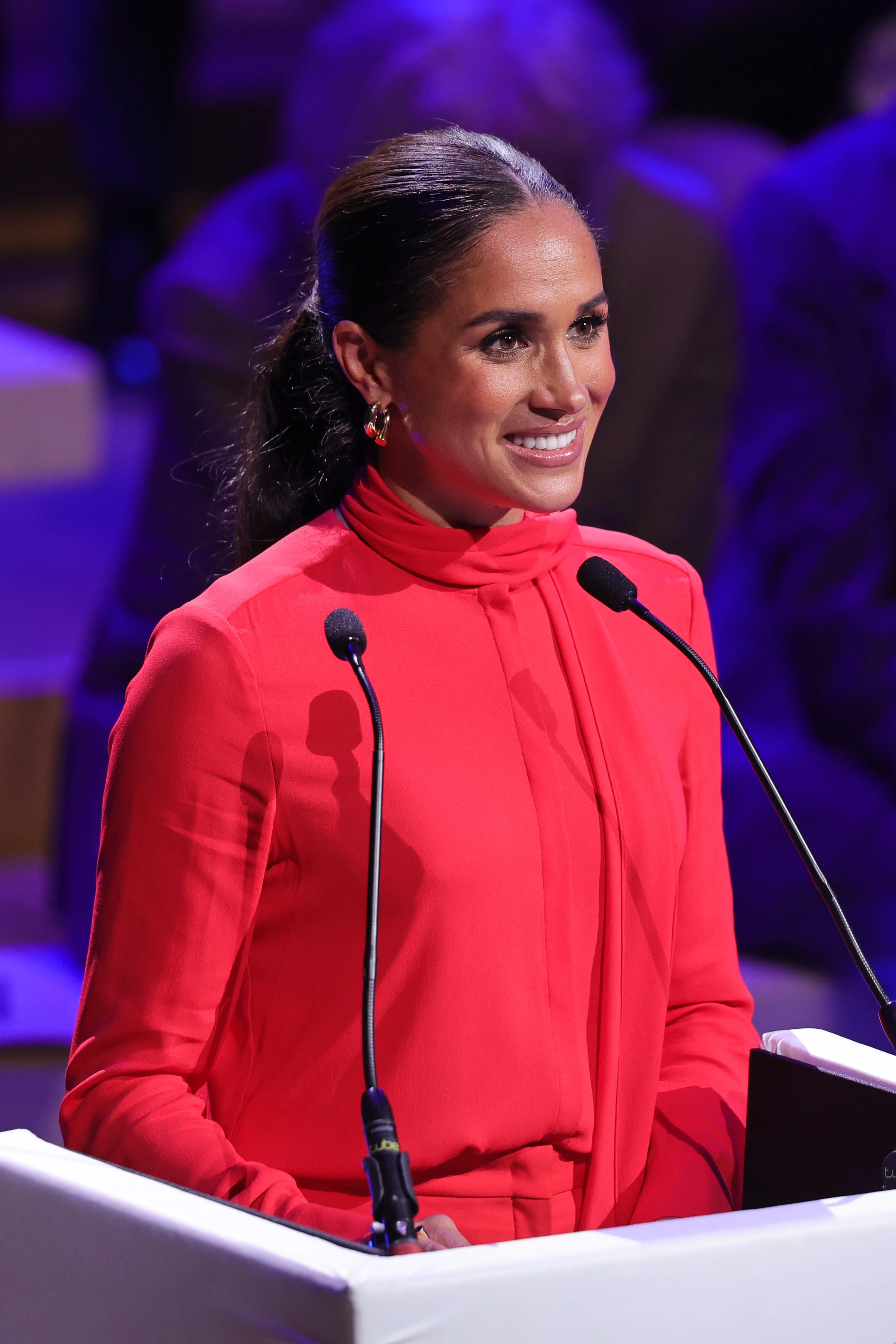Meghan egy élénkpiros, hosszú sáldíszes, selyem Valentino blúzban érkezett az eseményre, amit színben tökéletesen hozzá passzoló nadrággal és piros Aquazzura magas sarkúval viselt. A sikkes üzleti szettjét arany ékszerekkel dobta fel, a haját pedig szoros copfba fogták.