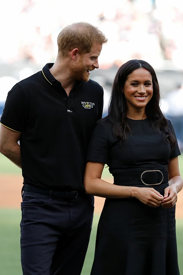 Harry herceg a helyzetnek megfelelően lazára vette a formát, fekete Invictus Games logóval ellátott pólóban volt és farmerben, Meghan már egy fokkal elegánsabb volt fekete Stella McCartney ruhájában, amit egy nagy öv díszített a derekán, hozzá pedig egy lapostalpú, hátul nyitott Aquazzura cipőt viselt.