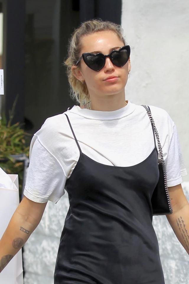 Miley a spagettipántos, fekete selyemruhája alatt fehér pólót viselt, hozzá pedig egy ütős Converse teniszcipőt – ezzel a szettel akár a 90-es évek bármelyik sitcomjából is kiléphetett volna, de természetesen nem maradt el az igazán mileys kiegészítő sem ennek a szívalakú napszemüvegnek a formájában.