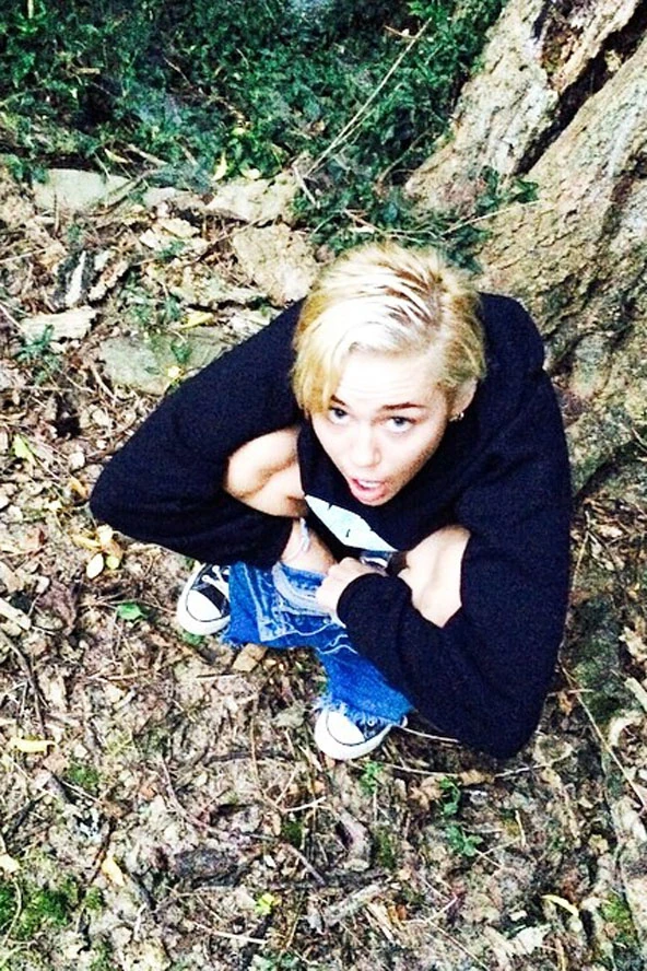 Miley Cyrus a hétvégén elment kirándulni. Meglátogatott egy romos erdei kunyhót. Sétált, sétált kiskutyájával, majd egy fa tövében lecsücsült. Könnyíteni magán.