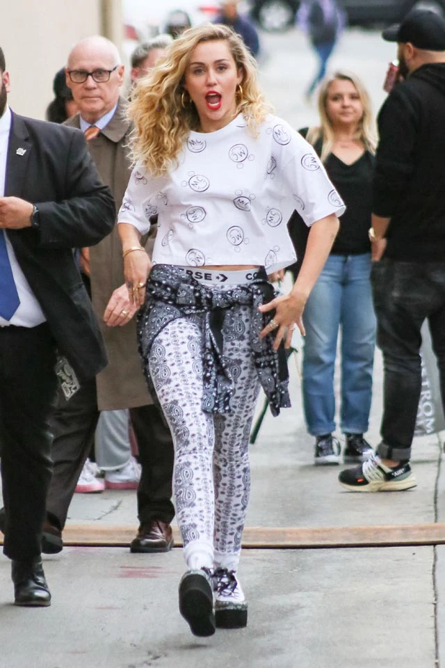 A show forgatásán azonban nagyon kitett magáért, tetőtől talpig vidám, mintás Converse darabokat viselt. A fekete-fehér pszichedelikus motívumokkal díszített ruhakollekció igencsak illik Miley vadóc stílusához, az MC monogramos smiley-k pedig akár a popsztár védjegye is lehetnének, melyek hol a pólóján, hol a biciklis jégeralsóján köszöntek vissza.