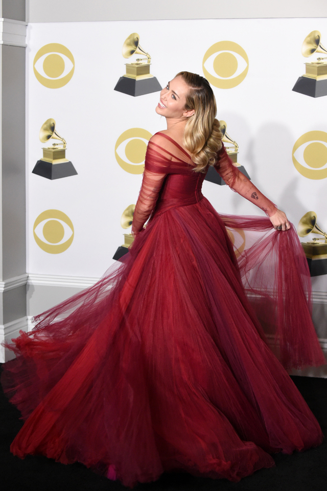 A szuper Jean Paul Gaultier szett után Miley egy hihetetlenül gyönyörű, vérvörös Zac Posen tüllestélyiben mutatkozott a színpadon, hogy Elton Johnnal közösen fellépjenek a gála alatt.