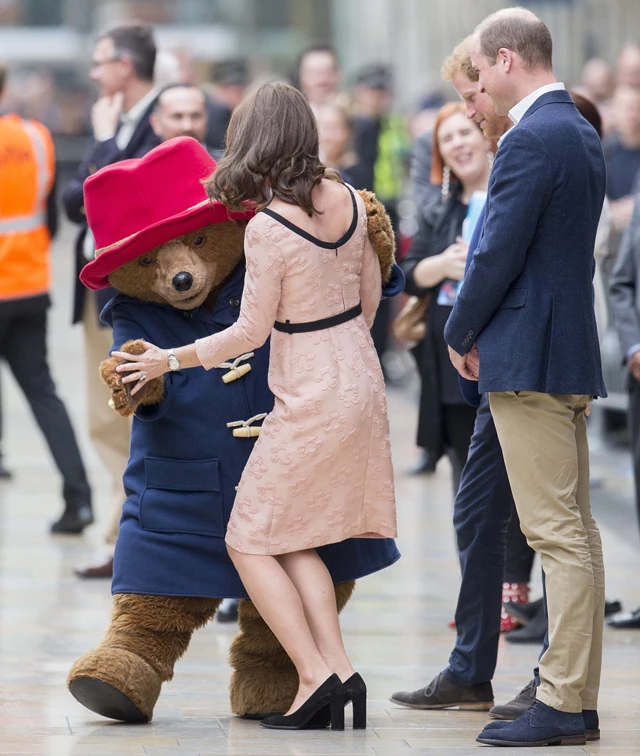 Most például egy embernagyságú Paddington mackóval perdült táncra az állomáson a hercegné, akik szokásához híven ultrasikkes volt az eseményen. A harmadik gyermekével várandós előkelőséget még meg is pörgette a maci. Harry herceg rajongóinak találtunk egy képet, amelyen a híres mackó karon fogja a házasodni készülő herceget.