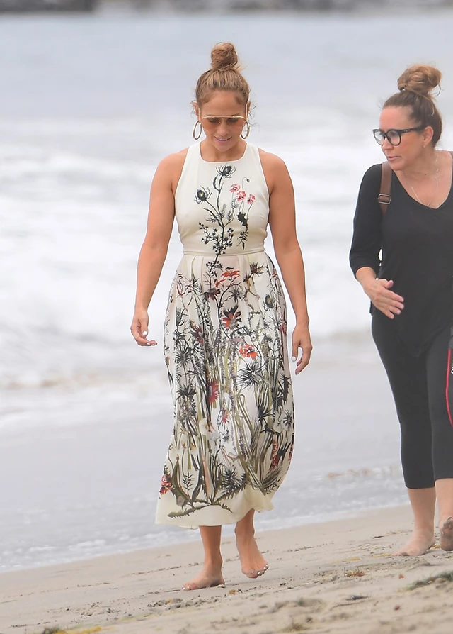 A fotósok épp egy kellemes délutáni séta közben kapták a kedves társaságot lencsevégre, Jennifer Lopez egy bájos, virágos hímzéses nyári ruhát viselt a sétához, haját pedig szokásához híven kontyba csavarta.