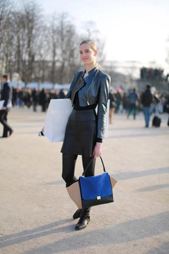 Azt tudjuk, hogy a modellek közkedvelt stílusa, mikor nem dolgoznak, az egyszerű, kicsit fiús, többnyire fekete, néha grunge-osnak is mondható szettek variálása. Nos, Axente Vanessa is hasonló, tetőtől-talpig fekete összeállításban vásárolgatott. A szépséges modellen magas derekú, rövid bőrszoknya volt, melyet egy különleges, szegecsekkel kirakott Napsugár von Bittera motoros bőrdzsekivel, lovagló csizmával és szupertrendi csónaktáskával viselt. Az eredmény kétségtelenül sikkes, egyetértesz?