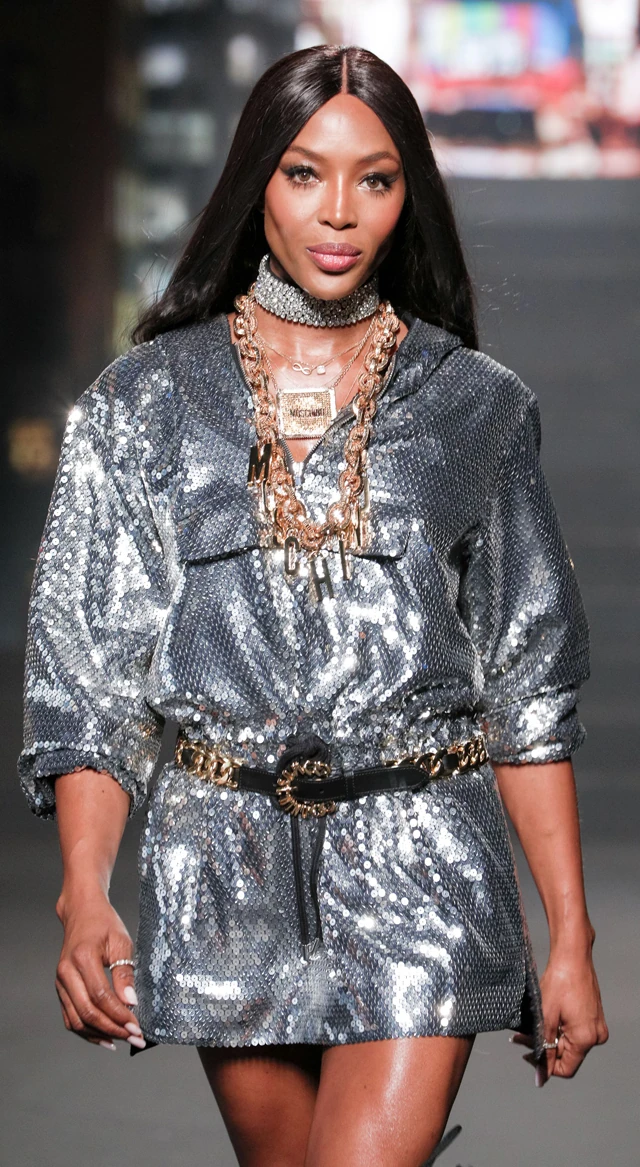 A Moschino X H&M New York-i divatbemutatóján a 48 éves szupermodell tökéletesen festett a diszkógömb inspirálta ruhájában. A kifutón még Taylor Hill, Joan Smalls, Stella Maxwell, Candice Swanepoel, és Winnie Harlow is végigvonult.