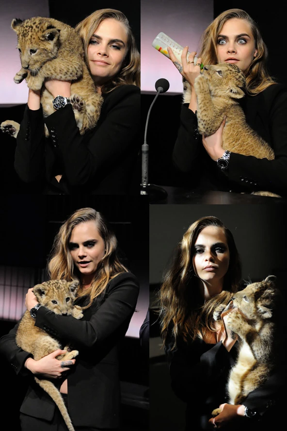 A mostanában megunhatatlan Cara Delevingne szereplése a kampányban talán nem is meglepő, hiszen lassan megszokhatjuk, hogy minden valamire való cég igyekszik elnyerni az angol üdvöske kegyeit. A múlt heti bejelentésen nem csupán a topmodell tette tiszteletét, hanem elhozta reklámbéli társát, egy kölyök oroszlánt is. Mivel Cara Delevingne imádja az állatokat, és az oroszlánokat különösképpen (ez egyik ujját oroszlános tetoválás díszíti ), ezért láthatóan élvezte a helyzetet. Nem különben a bébi nagymacska, aki a fotózás során összebarátkozott már az szépséggel. Nos, meglehetősen cuki ez a párosítás, nem?