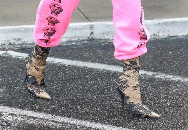 Ezt a melegítő nadrágot ezzel a csipkés magas sarkú csizmával csak akkor vennénk fel maximum, ha épp otthon pihennénk, csengetne a futár és le kellene futnunk átvenni a csomagot. Lehet, hogy velünk van baj, Kim stílusa azonban most nagyon nem jött át nekünk.